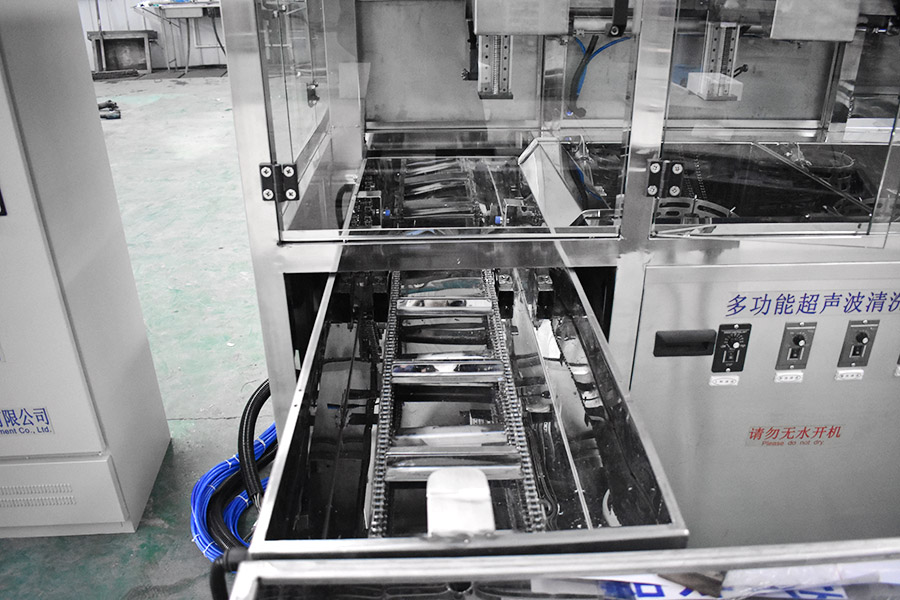 該設備有自動上下料及轉角系統、超聲波清洗系統,自動拋動、自動溢流和油污分離裝置,噴淋系統、自動高壓切水系統、自動烘干系統。機械手自動輸送系統采用高精度直線導軌配合高精度位置檢測傳感器,機械手可以準確的實現工件的抓取和放置。自動進排液和自動加溫系統完全實現了無人干預,自動運行,很大程度上降低了工人的勞動強度。先進的霧氣處理系統可以將清洗時產生的霧氣冷凝回流,空氣經過濾和活性炭吸附后排出。