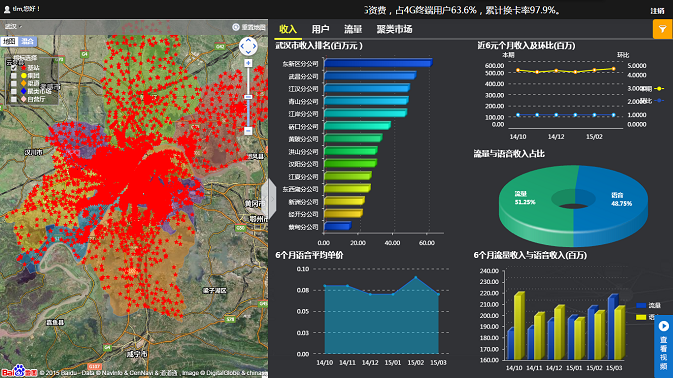 基于GIS地圖的沙盤式管理理念,依托于百度地圖的地理信息,結合武漢移動已有的業(yè)務數(shù)據(jù),億信BI實現(xiàn)了對武漢移動各區(qū)域市場、企業(yè)客戶、渠道網(wǎng)點的集中管理和實時監(jiān)控,真正實現(xiàn)了企業(yè)的沙盤式管理思想。