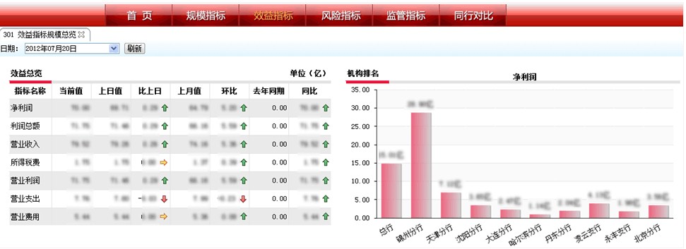 領(lǐng)導(dǎo)駕駛艙是對(duì)于管理者開放的模塊,包括管理者日常工作中最關(guān)注的指標(biāo),并且通過直觀的圖形的方式展示,便于管理者快速了解銀行的經(jīng)營(yíng)狀況以及進(jìn)行風(fēng)險(xiǎn)的預(yù)警。