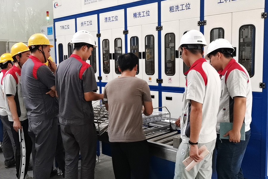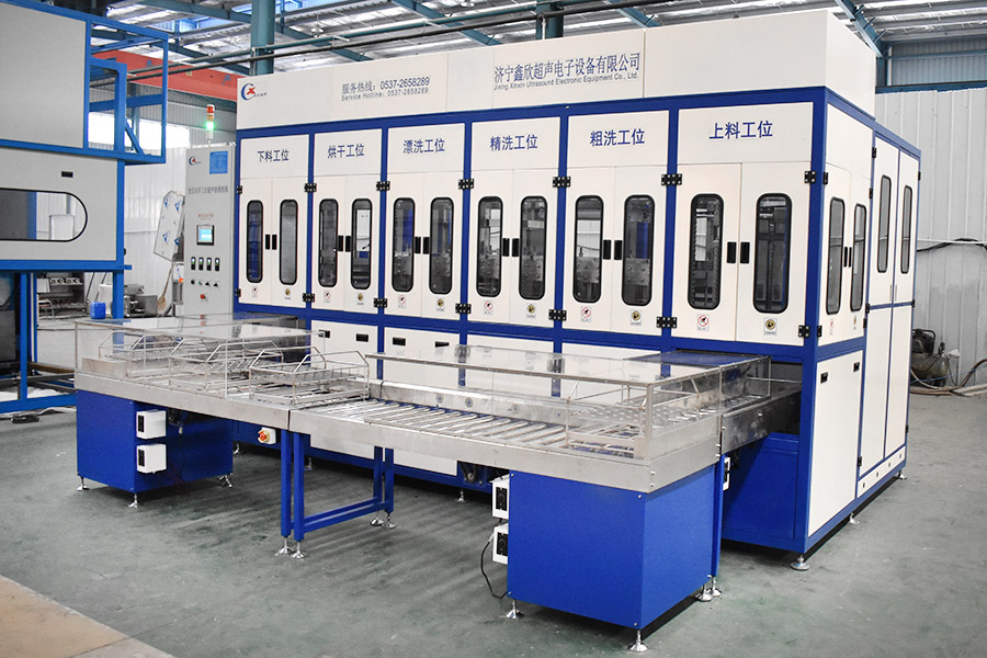 The equipment has automatic loading and unloading and corner system, ultrasonic cleaning system, automatic throwing, automatic overflow and oil separation device, spray system, automatic high-pressure water cutting system, and automatic drying system. The robot automatic conveying system adopts high-precision linear guide rails and high-precision position detection sensors, and the robot can accurately grasp and place the workpiece. The automatic feeding and discharging and automatic heating system completely realizes unmanned intervention and automatic operation, which greatly reduces the labor intensity of workers. The advanced mist treatment system can condense and return the mist generated during cleaning, and the air will be discharged after being filtered and adsorbed by activated carbon.