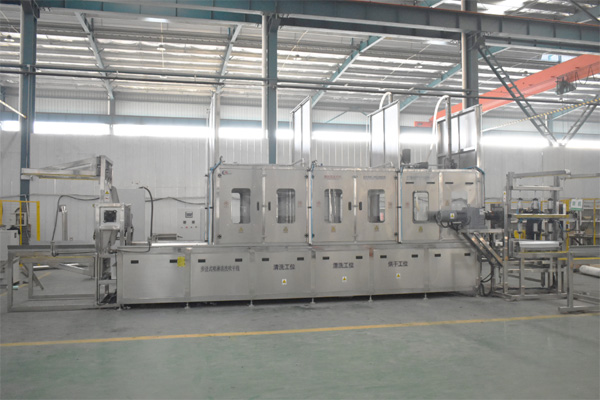 01)通過設備上面的觸摸屏設置設備運行的各項參數,待清洗料桶通過 AGV 小車輸送到緩存支架上,由夾持裝置將工件加緊經翻轉電機將工件旋轉 180 度,使料桶口向下置于上料工位。→(02)設備運行裝置自動將料桶運行到噴淋粗洗工位,高壓噴淋粗洗工位設有桶內壁旋轉噴頭,對桶內壁進行清洗。桶體外側設置頂部及側面噴頭對料桶外壁進行清洗。工位設置探測器,工件在運動時噴淋工位停止工作。→(03)料桶經過噴淋粗洗后設備運行裝置自動將料桶運行到噴淋精洗工位,高壓噴淋精洗工位設有桶內壁旋轉噴頭,對桶內壁進行清洗。桶體外側設置頂部及側面噴頭對料桶外壁進行清洗。工位設置探測器,工件在運動時噴淋工位停止工作。→(04)噴淋精洗完畢后,料桶運行到高壓風切吹干工位,熱風吹干采用高壓風機和熱風發生器,可以對工件進行快速干燥。→(05)工件經熱風吹干完畢后運行至下料翻轉工位。由夾持裝置將工件加緊進行翻轉,工件翻轉180度以后放置到緩存支架上由AGV小車帶動料桶進入干凈桶暫存區。