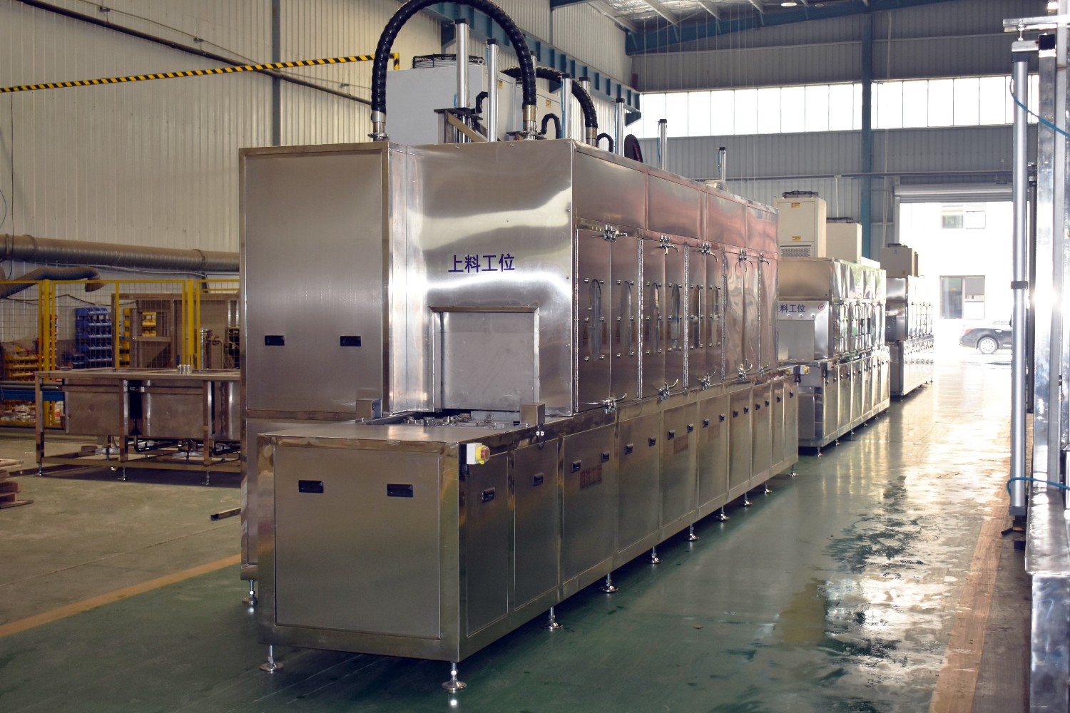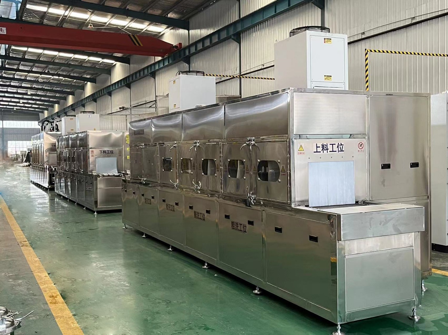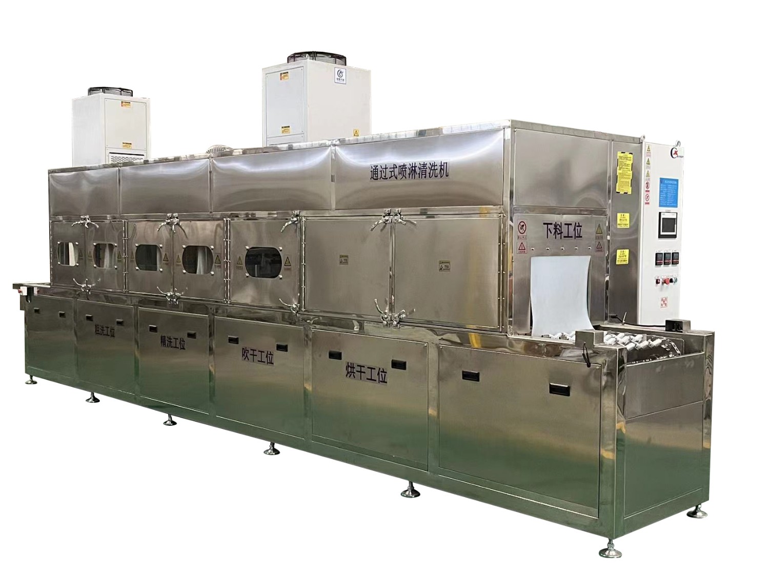 該設備有上下料網帶、噴淋清洗工位、噴淋漂洗工位、高壓風切、熱風烘干工位、溫控水加熱系統、風機、溫控空氣加熱系統、PLC+觸摸屏控制系統、管路系統及智能電器控制系統等組成。自動進排液和自動加溫系統完全實現了無人干預,自動運行,很大程度上降低了工人的勞動強度。先進的霧氣處理系統可以將清洗時產生的霧氣冷凝回流,空氣經過濾和活性炭吸附后排出。